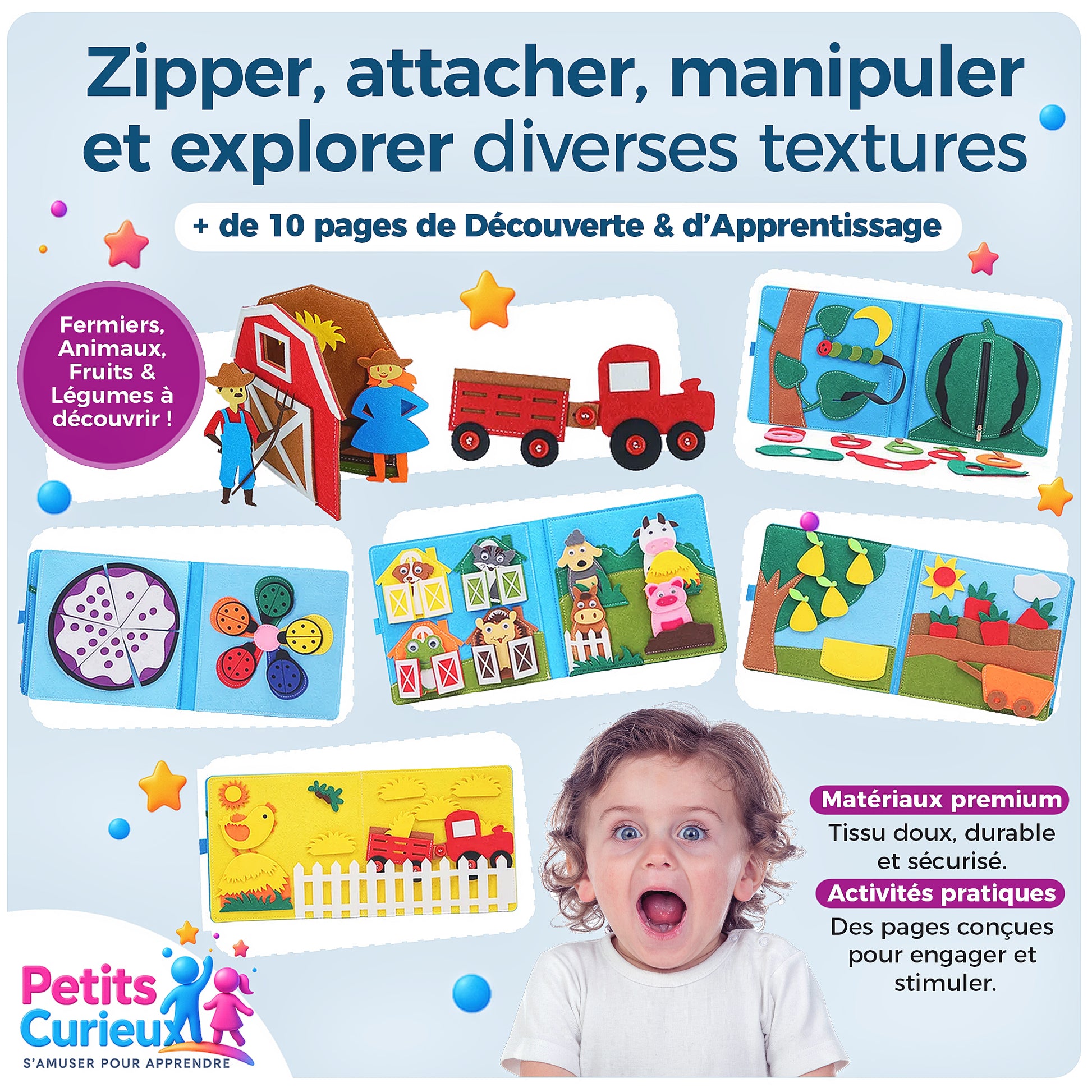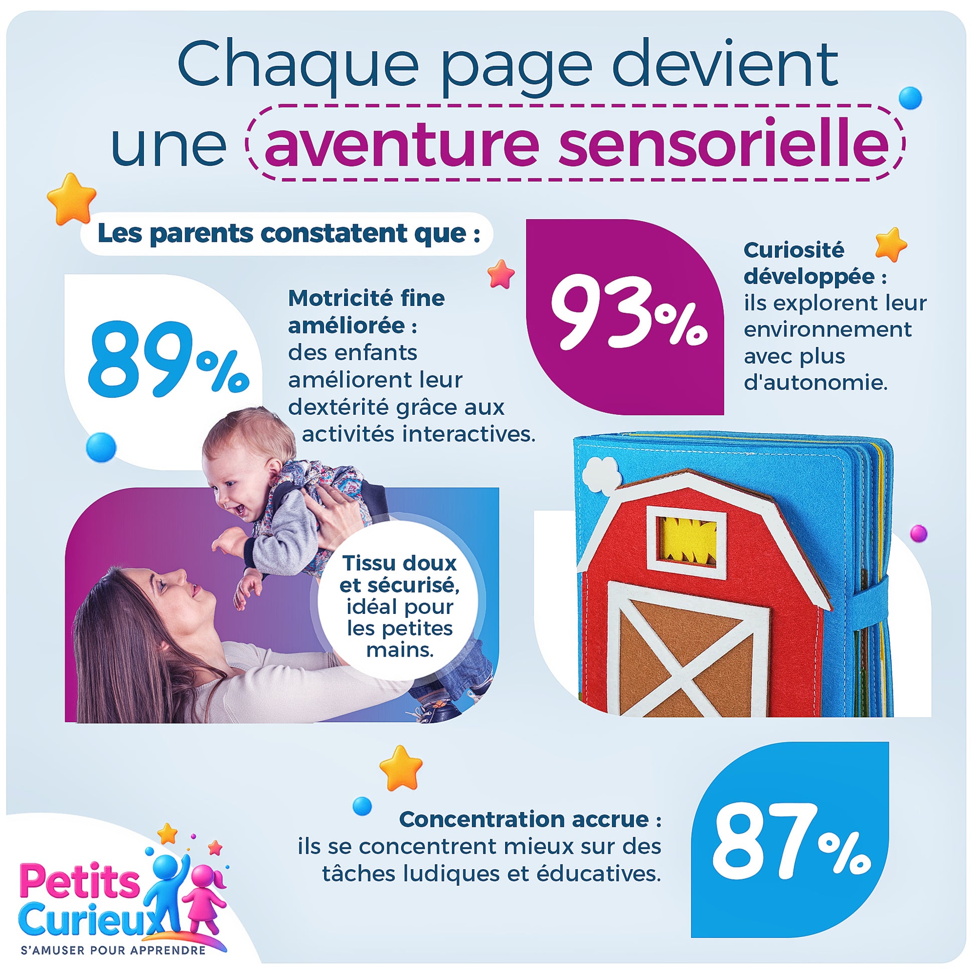 Imaginez un livre qui se transforme en une aventure sensorielle amusante ! Le Livre des Curieux n'est pas juste un livre : c'est un outil interactif qui rend l'apprentissage ludique. En l'adoptant, vous offrez à votre enfant une expérience magique qui réveille sa curiosité, booste sa motricité fine et éveille ses sens de façon joyeuse.